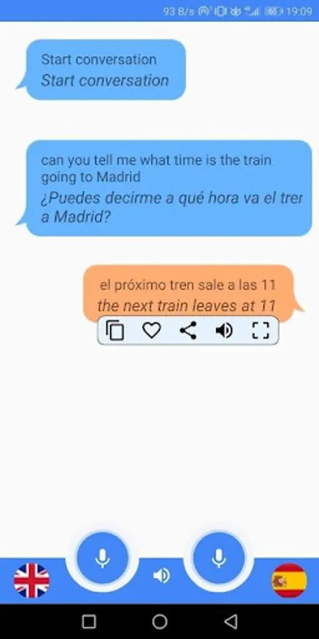 - কথোপকথন পৃষ্ঠা: অ্যাপ্লিকেশনটি আপনার যে কথোপকথনটি অন্য কোনও ভাষা বলতে পারে তার সাথে অনুবাদ করবে
