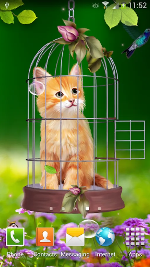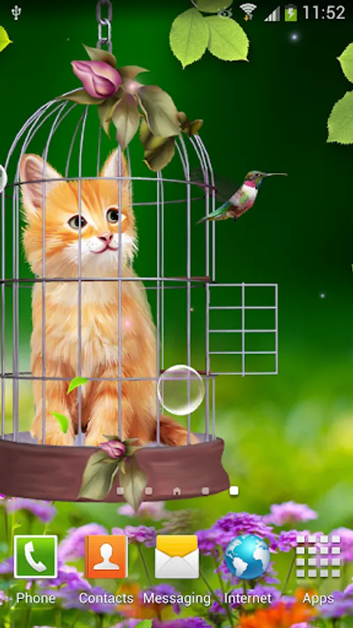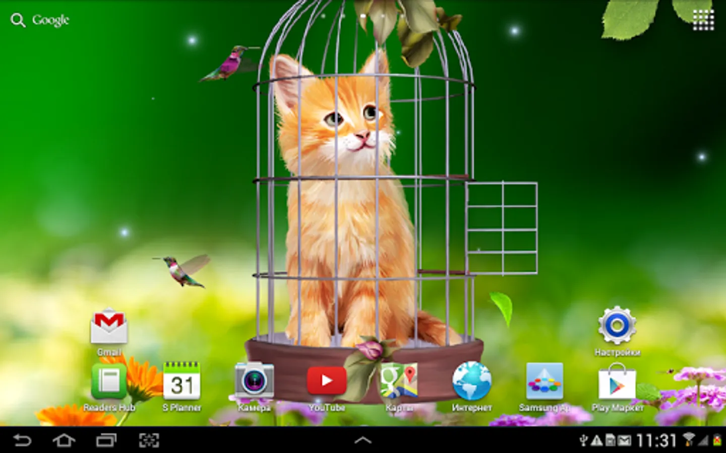 How to set Kitten & Hummingbirds Live Wallpaper on the screen of your phone: Home -> Applications -> Settings -> Display->Wallpapers -> Home screen wallpaper -> Live wallpapers-> Kitten & Hummingbirds