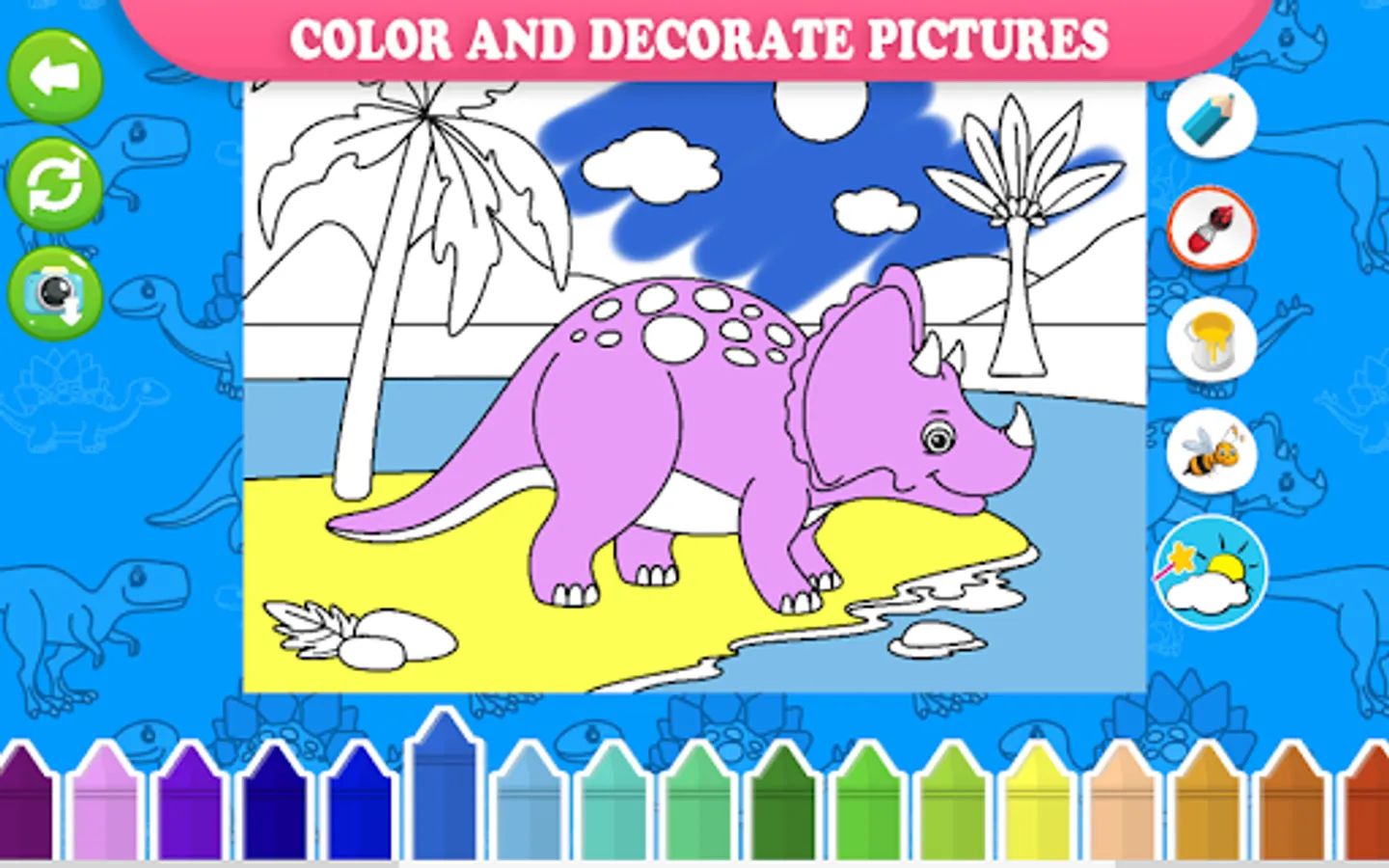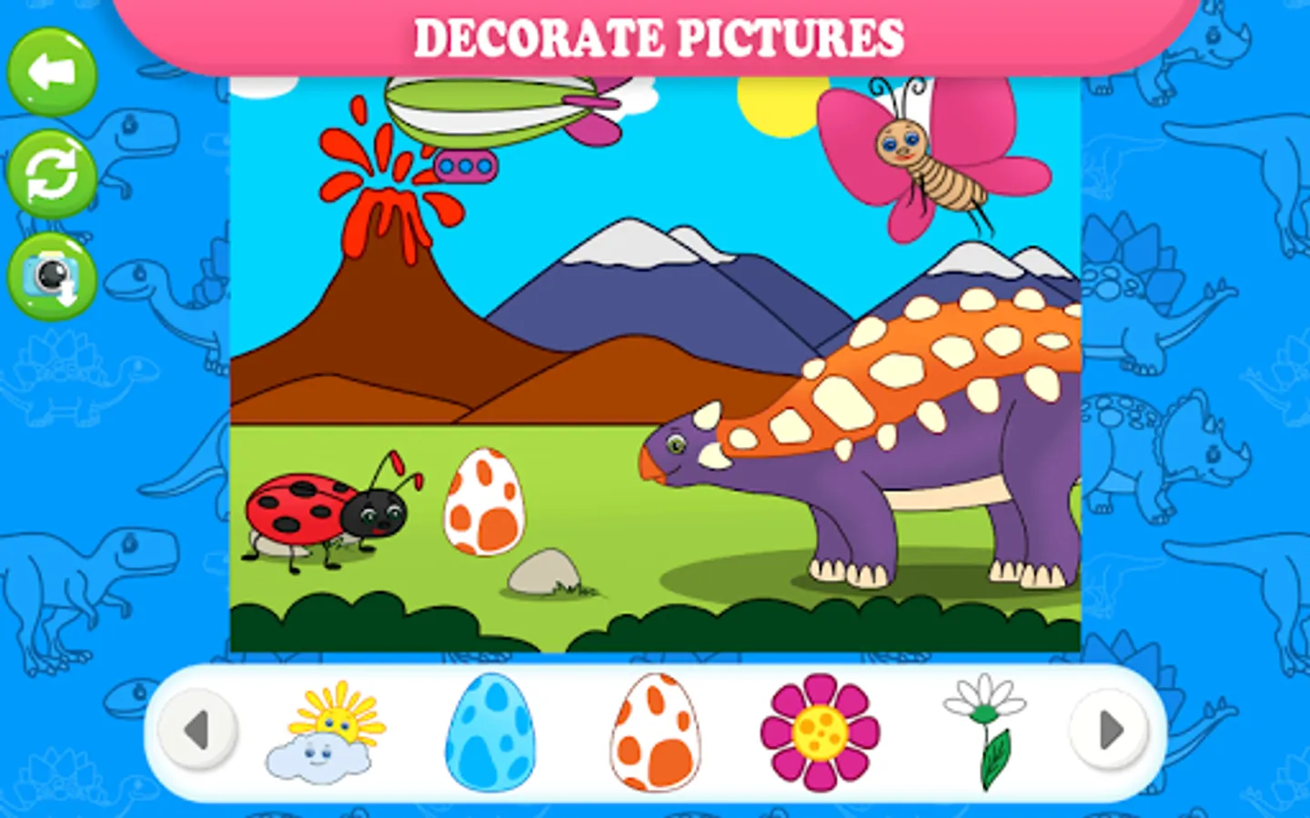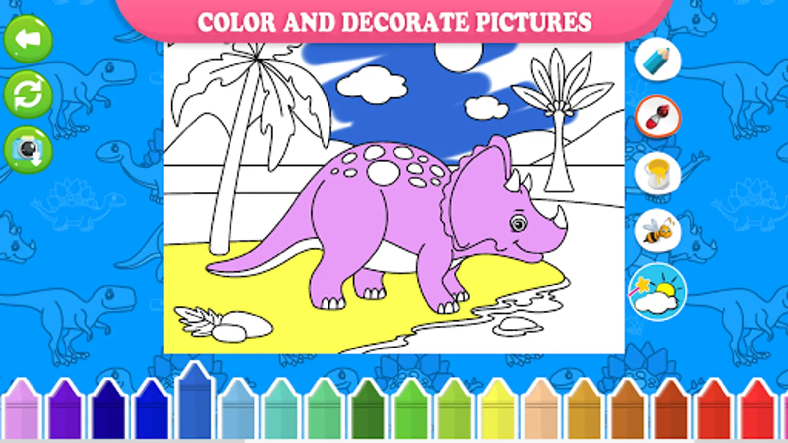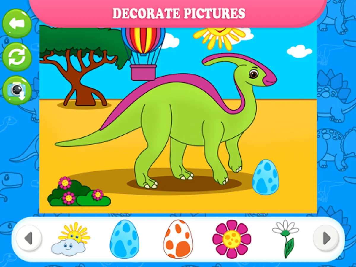 Coloring and Decorating - Draw with your fingers, decorate colorful backgrounds with beautiful stickers, and decorate coloring pages with dinosaurs. And when your masterpiece is ready, you can save it in the gallery and share it with your friends and family.