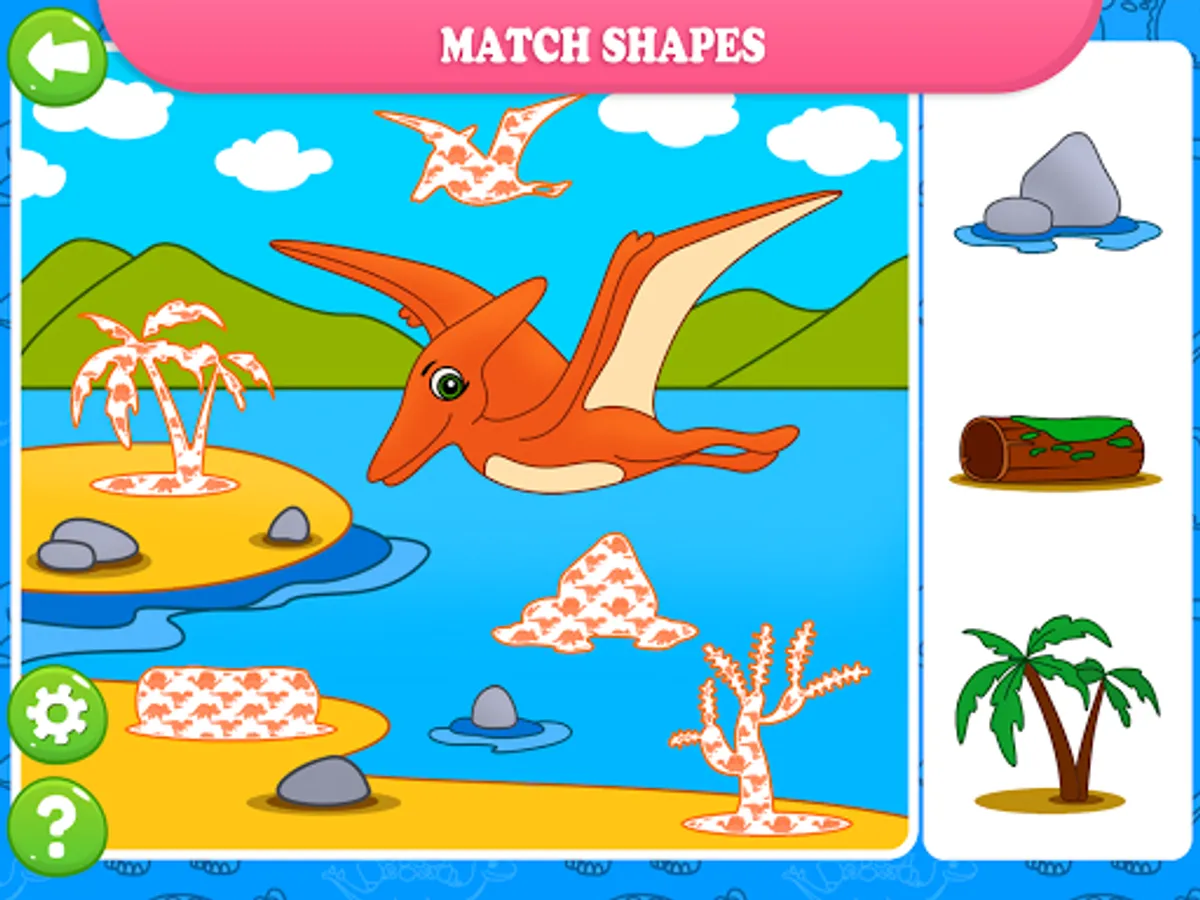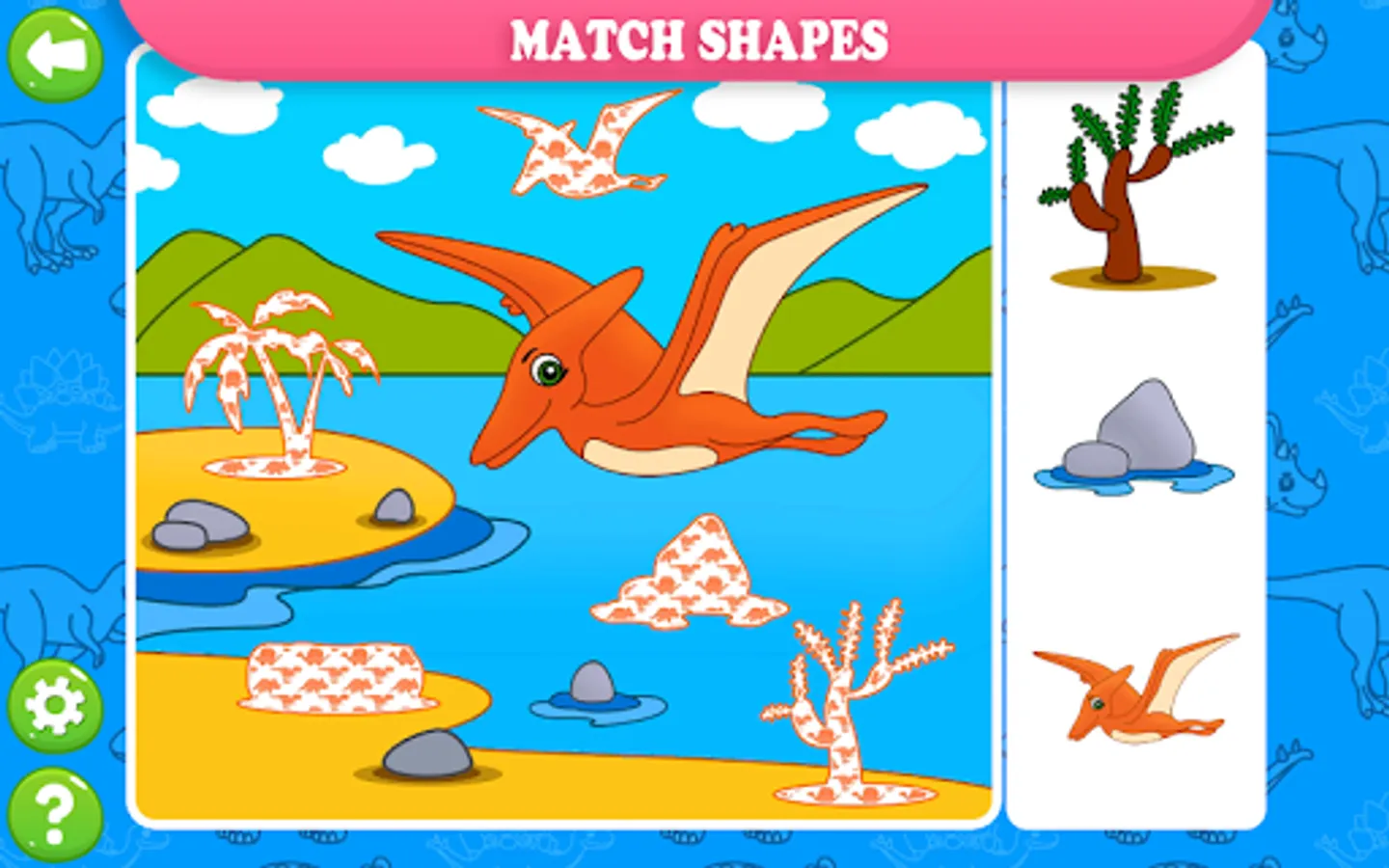 Matching shapes – A colorful background with a dinosaur and empty silhouettes appears on the screen, it must be filled with the appropriate things. To complete the activity, fill in all the empty spaces in the picture.