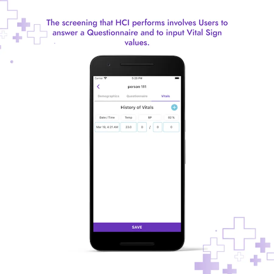 The screening that HCI performs involves Users to answer a Questionnaire and to input Vital Sign values. The Questionnaire and Vital Signs values are date and time stamped. A Check-In process begins by scanning a QR Code by the HCI Customer App. In order for the Users to share this information with the Facility the User is informed of the Scanning Policy (which inform the User that information being shared with the check-in business may be forwarded only upon request by local Department of Health).