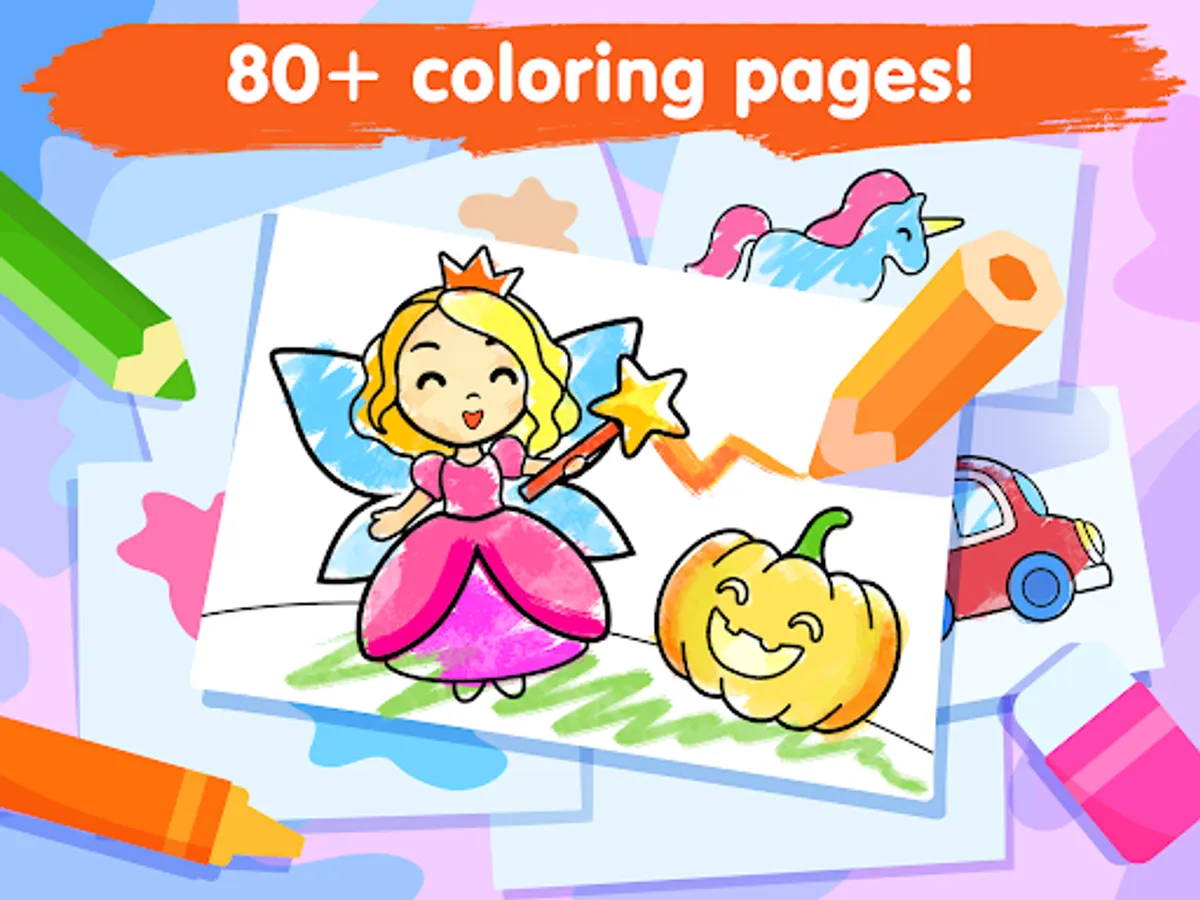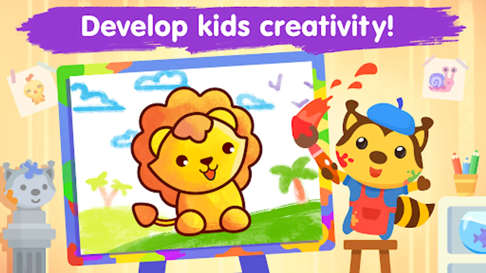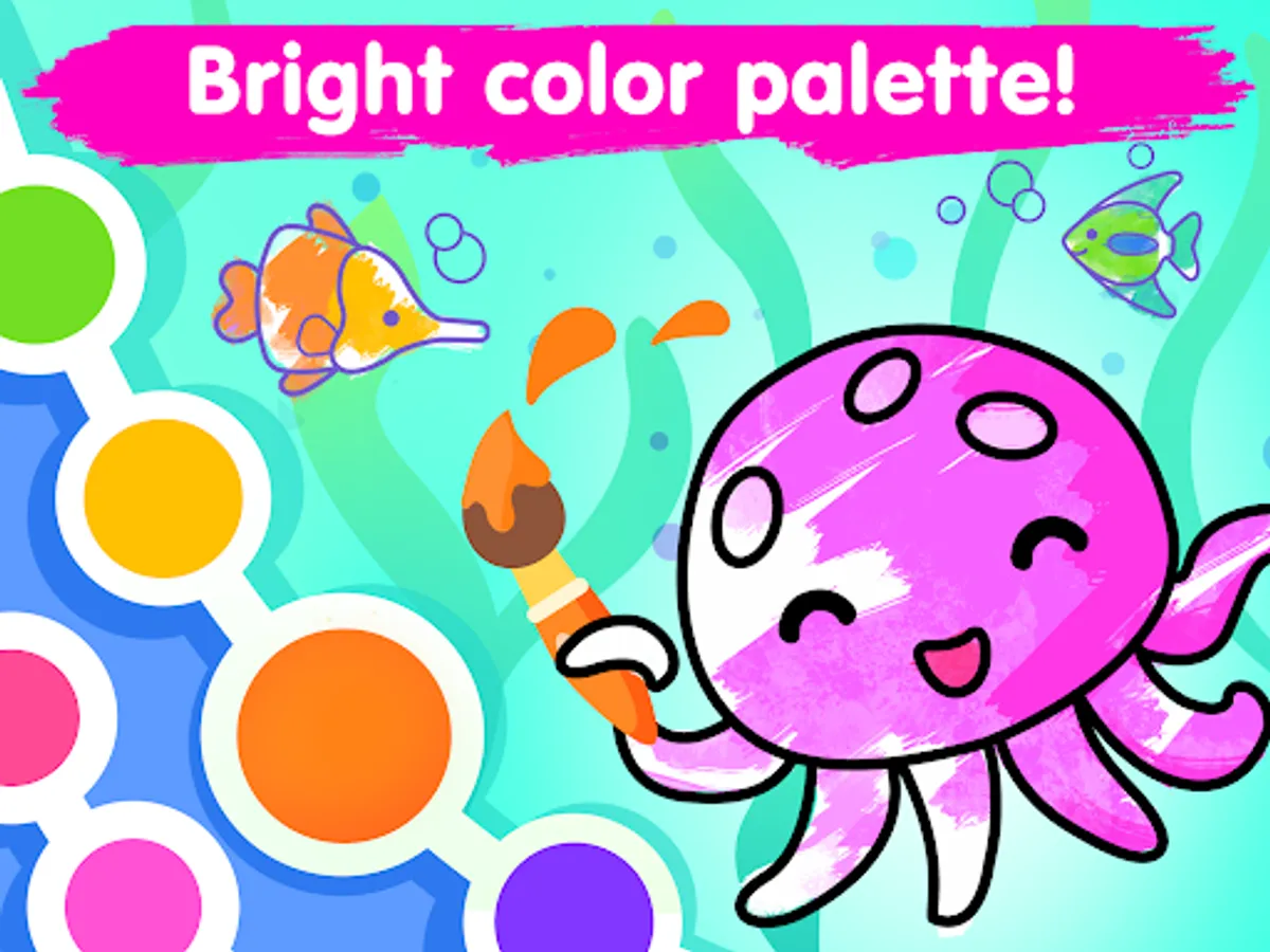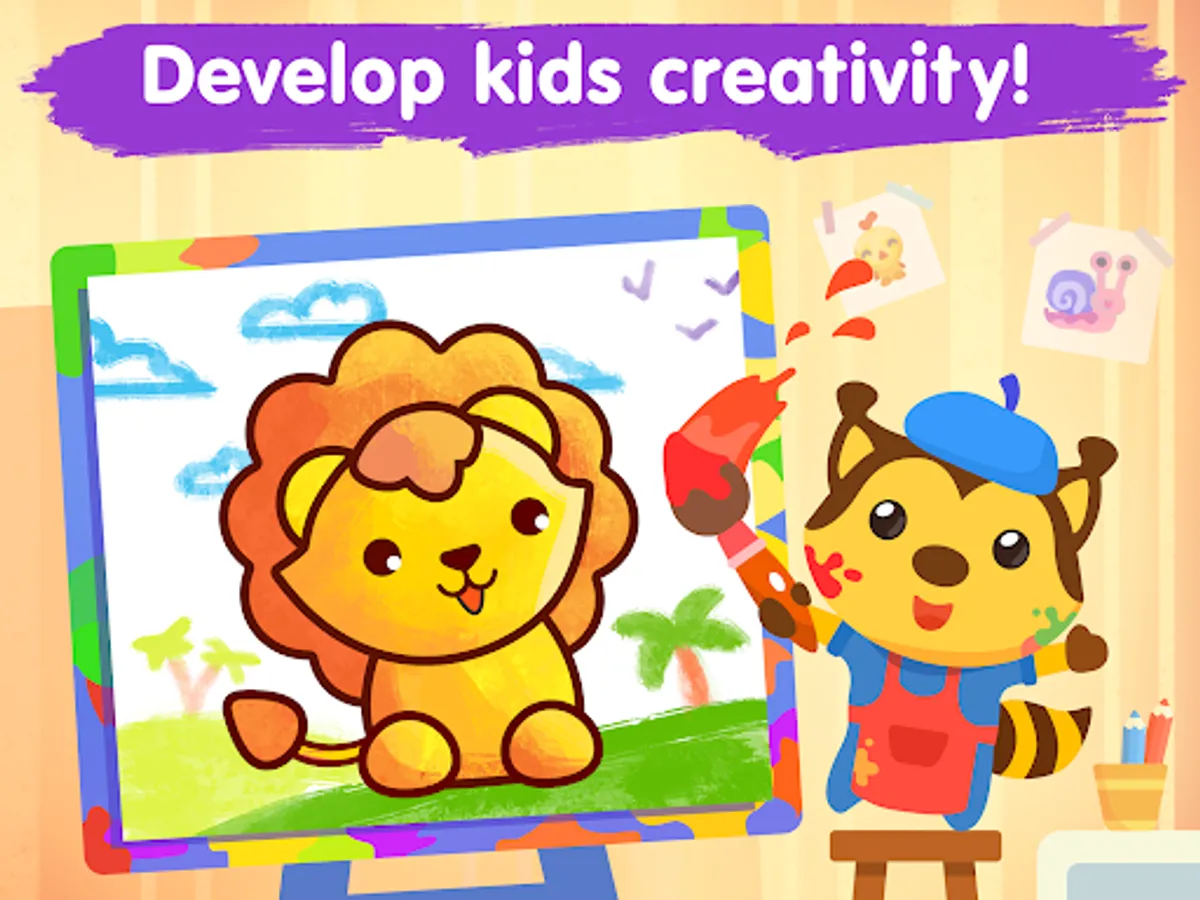 Kids Coloring gives you a full range of baby games' attributes: cute pictures, an array of vivid colors and many different tools for coloring. Immerse children in a world of color, magic and creativity.
