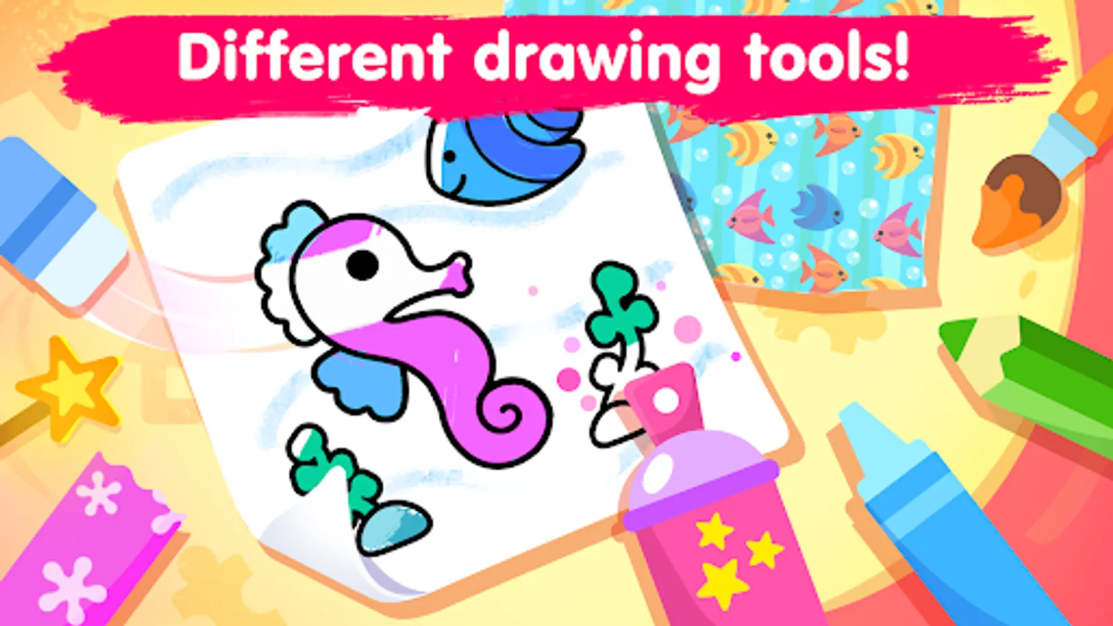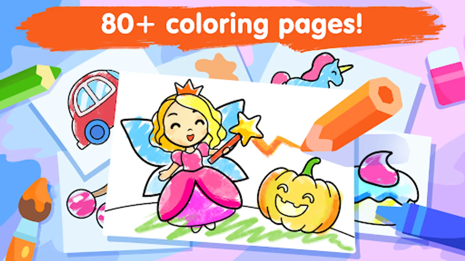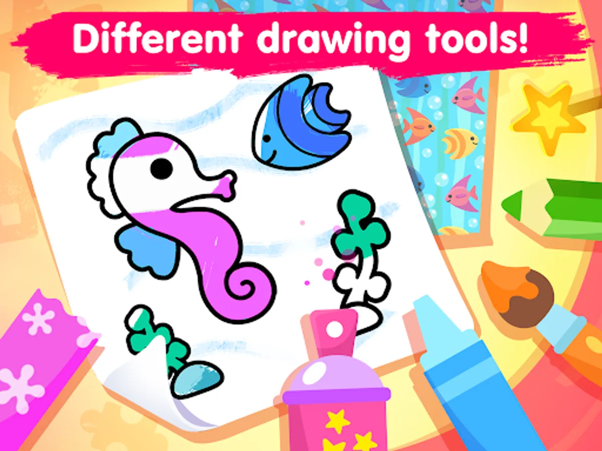 Kids Coloring gives you a full range of baby games' attributes: cute pictures, an array of vivid colors and many different tools for coloring. Immerse children in a world of color, magic and creativity.