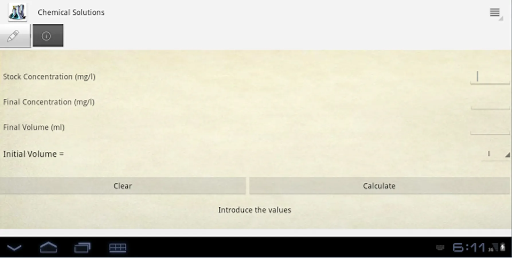 Are you working with chemical solutions? A simple and intuitive application to calculate volumes of solutions and molarity. Try it free!