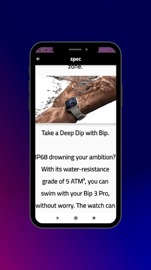 【Take a Deep Dip with Bip】IP68 drowning your ambition With its water-resistance grade of 5 ATM, you can swim with your Bip 3 Pro without worry. The watch can even track your activity data with its Open Water Swimming sports mode.