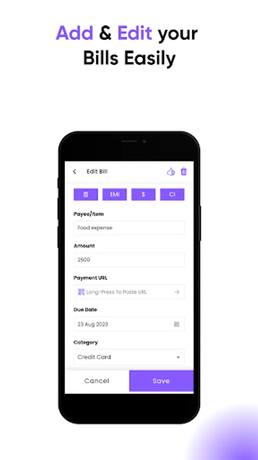 You can add new bills, by touch the '+' icon on the top right corner. Then fill in the friendly form details such as bill name, payment amount and the due date, etc. You can also create a recurring bill in a very flexible manner.