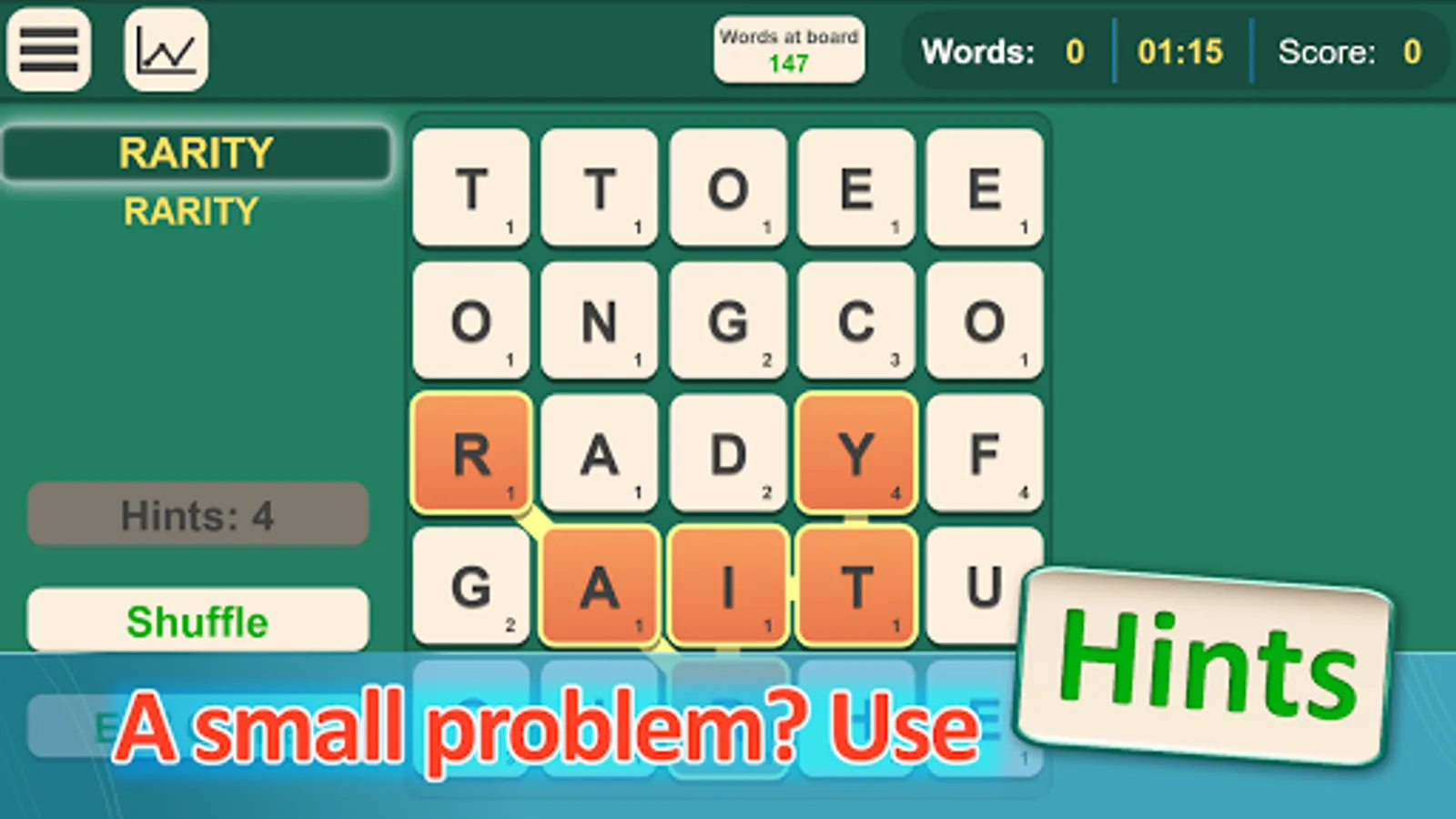 The new, innovative hint allow you to solve particularly difficult cases. With on-board word counter you can precisely determine when to board shuffle.