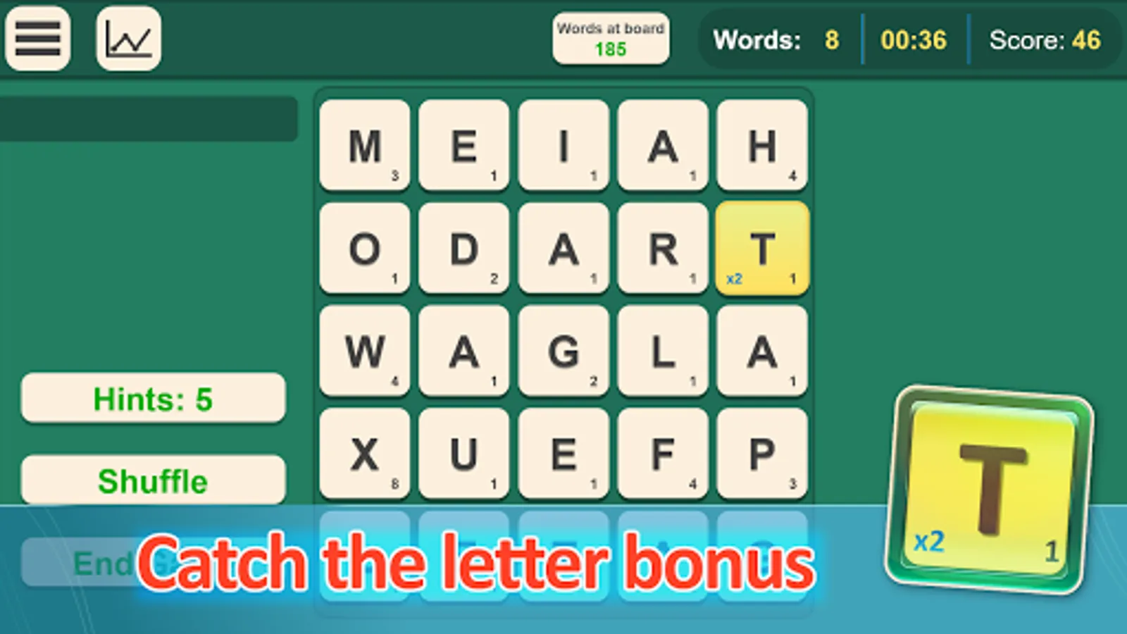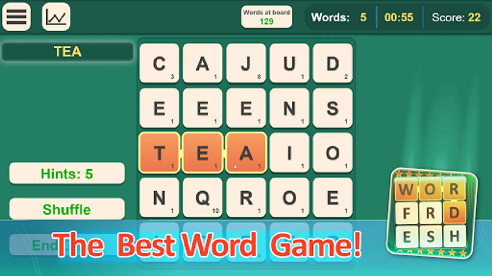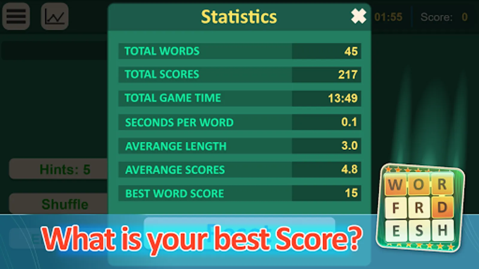 Word Fresh is a fun word finding puzzle game for everyone that is more exiting mixture of Scrabble and Boggle. Drag over the letters to create words. Valid words will increase your score and dwindling timer. Those letters will be changed with new ones falling from above.