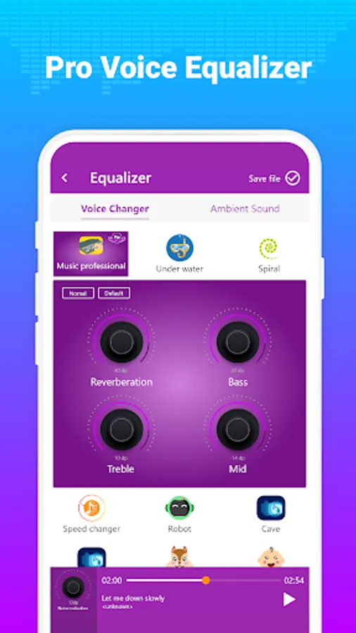 - Editing voice as professional with music studio effects: customizing echo, reverberation and mid tone