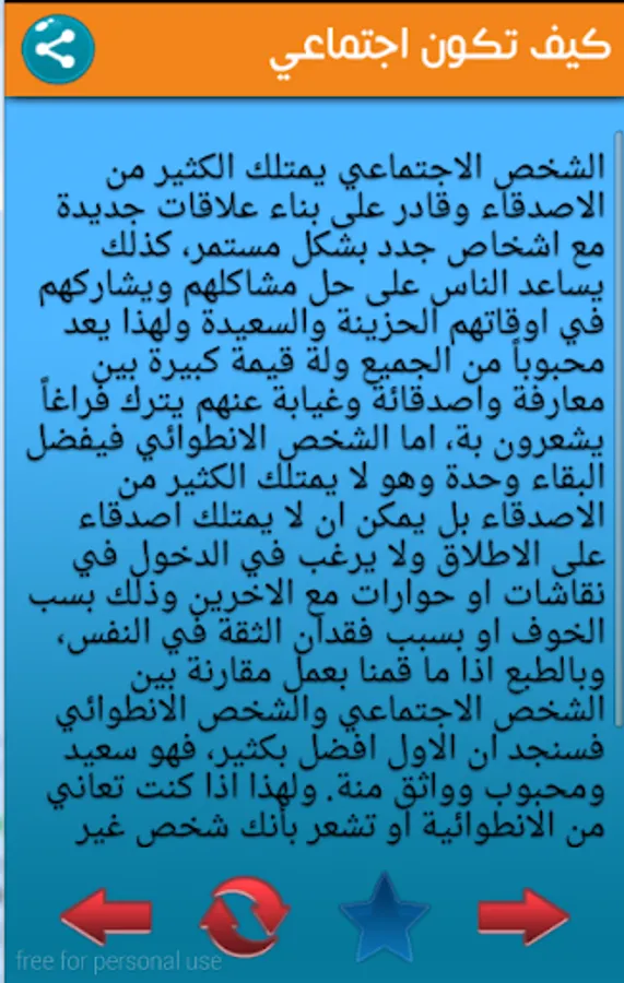 Social person has a lot of friends and is capable of building new relationships with new people continuously, people as well as help to solve their problems and share them in their time sad and happy and this is loved by everyone has a great value among acquaintances, friends, and he is away from them leaves a void they feel, either the person introvert prefers stay unit, which does not have a lot of friends, but can not have the friends absolutely do not want to enter into discussions or dialogues with others and that because of fear or because of self-confidence loss, and of course if we did a comparison between social person and the person introvert, we will find that the first much better, I am happy and confident and loved it. That is why if you suffer from inwardness or you feel someone is social, it is good to follow us in this application where we will display a variety of methods that will help you to become a social