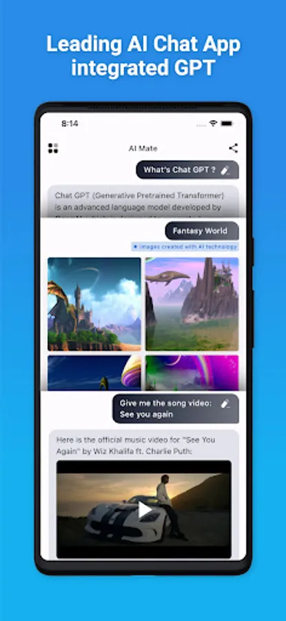 AI Mate is the leading GPT Chatbot and Image Generating Application with a lot of outstanding features such as easily asking anything you want to know, generating images with AI Technology.