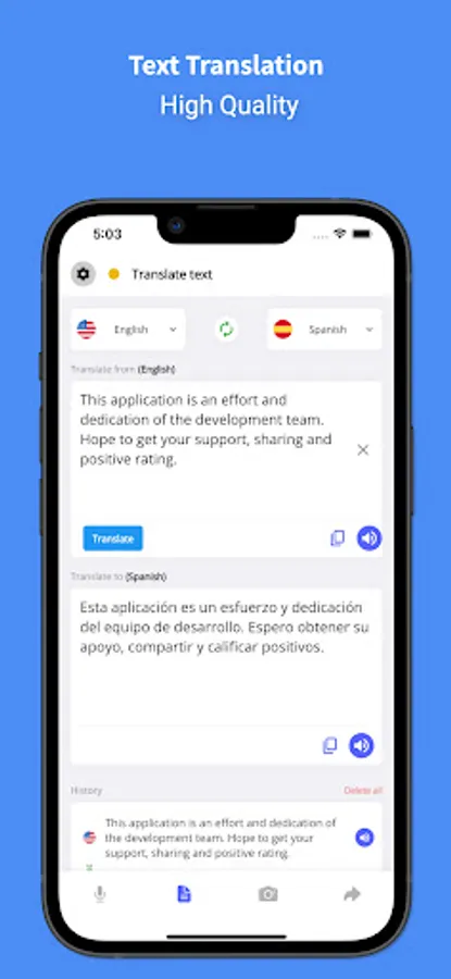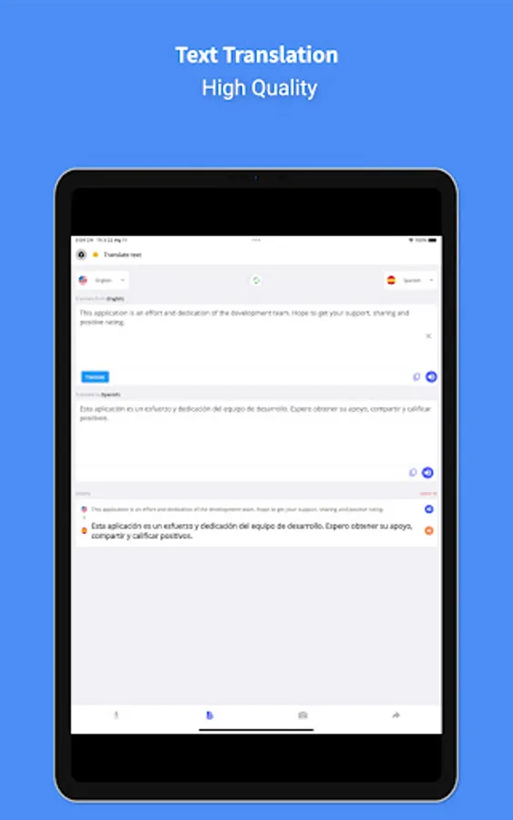 The voice translating feature translates to any your language and vice versa, translate text to voice with typing from keyboard.