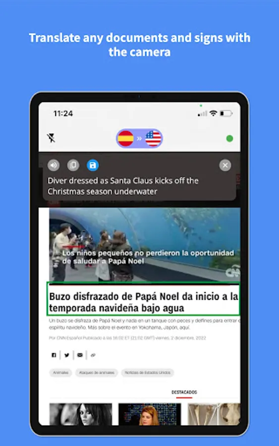 • Use your camera to translate any language instantly from documents, signs, menus.