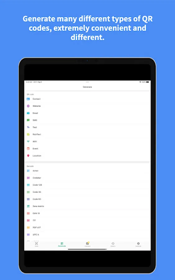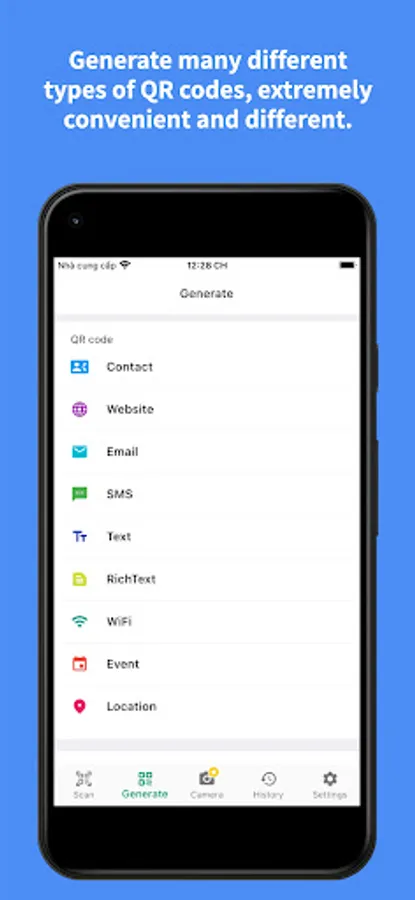 4. QR Code Generator : Generate many QR types such as: Phone Link, Contact, Website, email, SMS, Text, Rich Text, Wifi , Even, Location