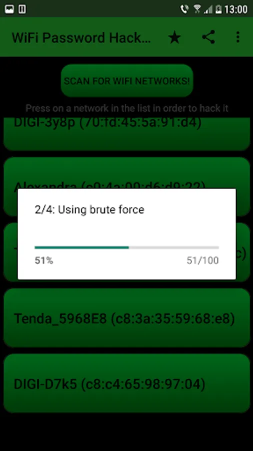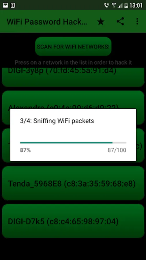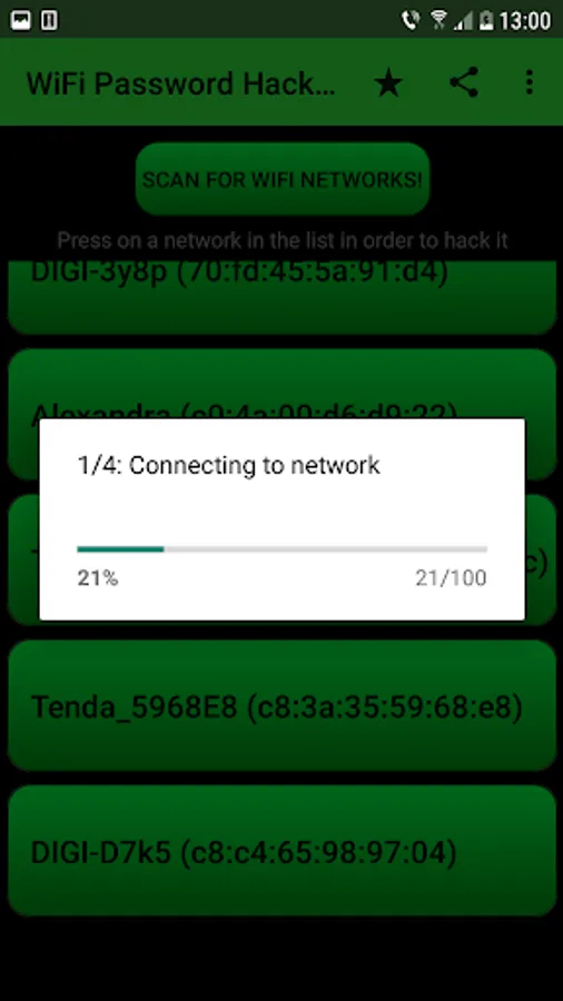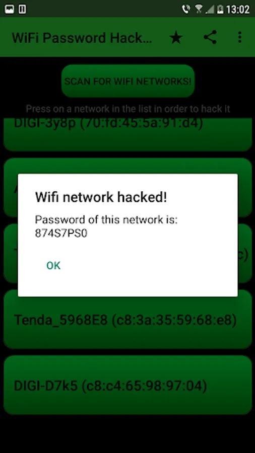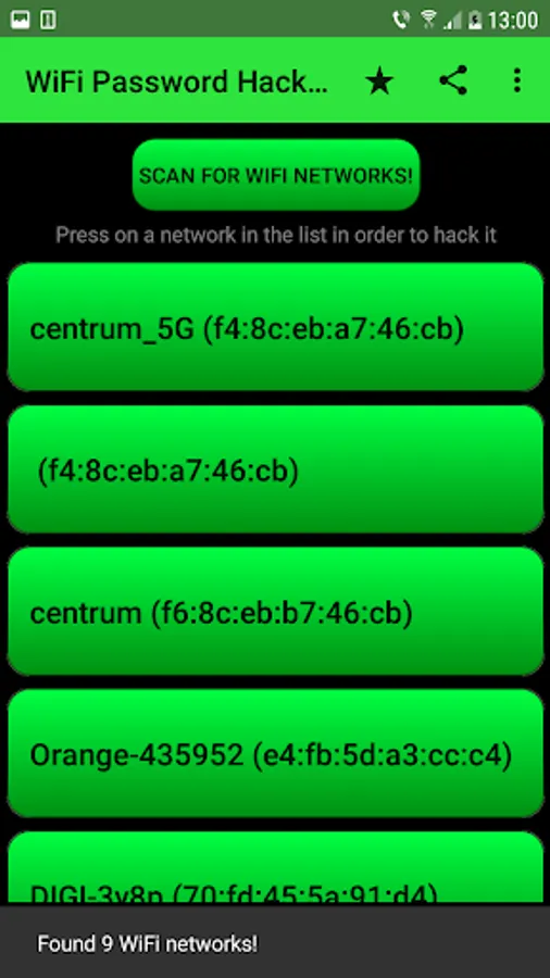 This tool has an wireless network scanner (the WiFi scanner) that will detect all the WiFi hotspots in range, either with good signal or bad signal. The detected wireless networks are listed by name and WiFi network MAC address. Select the desired WiFi network from this list and, after a simulation of hacking a fake generated password will be displayed, as if the target network was broken into. See how amazed your friends are by your hacker talent and enjoy!