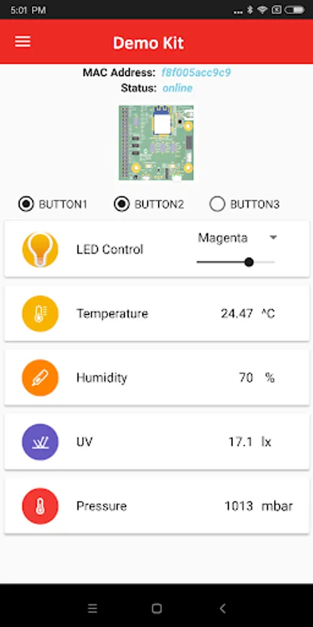 It can used to control LED on/off and light intensity (0-100%) and monitor the button state and sensor value (temperature, humidity, pressure, uv) on the kit.