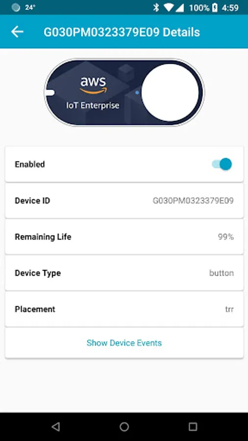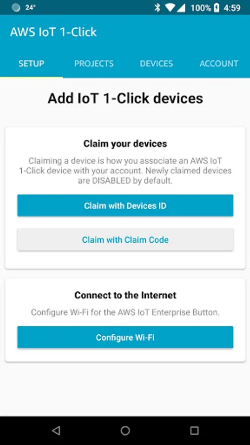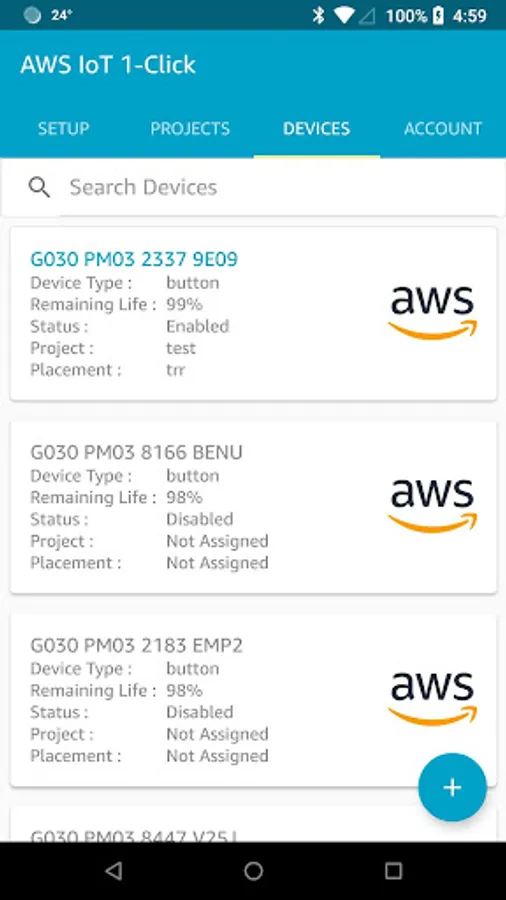 With AWS IoT 1-Click, it is easy to trigger a Lambda function from one of our supported ready-to-use IoT devices. This app allows you to claim devices you purchased into your account and configure them.