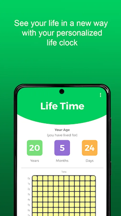 Introducing the LifeTime app, the ultimate tool for tracking your precious time on this earth. This app provides a stunning visual representation of your life, displaying how much time you've already spent and how much time you have left. The app is designed to motivate users to make the most of every moment by reminding them of the finite nature of life.