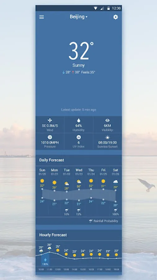 · Hourly / Daily Weather forecast: including weather prediction, the high / low temperature, rainfall, wind, etc. All these data are detailed in daily or even hourly.