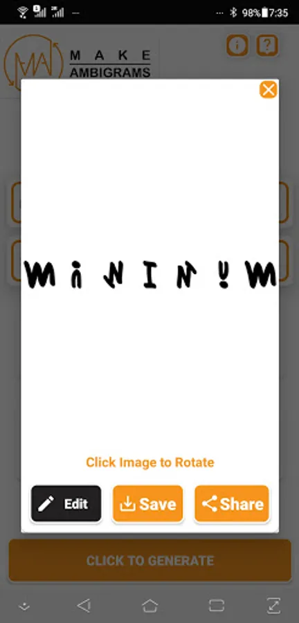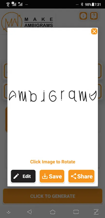 Make ambigrams from your phone on the go, all with the press of a button! (Needs a network connection to work.)