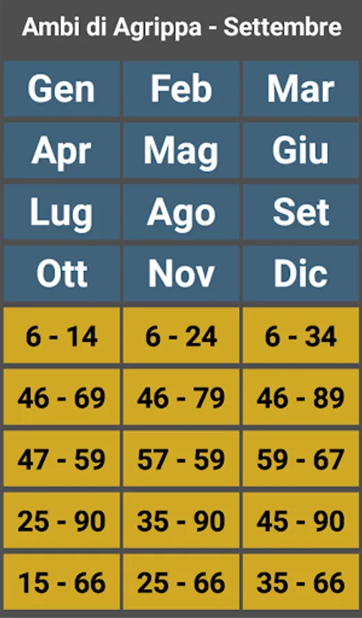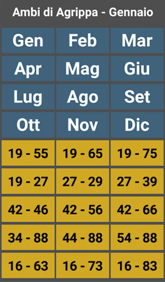 The Ambi of Agrippa are obtained from the twelve tables of the same name if the five numbers of each month are combined with the respective three corresponding numbers from the "Table of Rutilius". In fact, with the formation of 15 dry ambients every month it is possible to win both dry and maybe even more. Agrippa's boards are particularly effective on the Naples wheel, but can also be used to play on the other wheels.