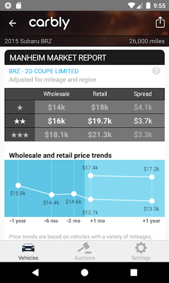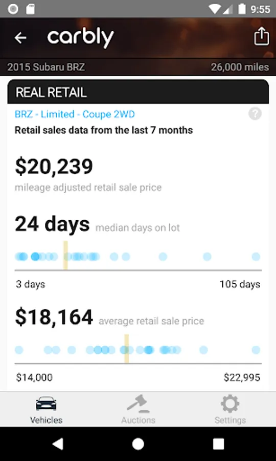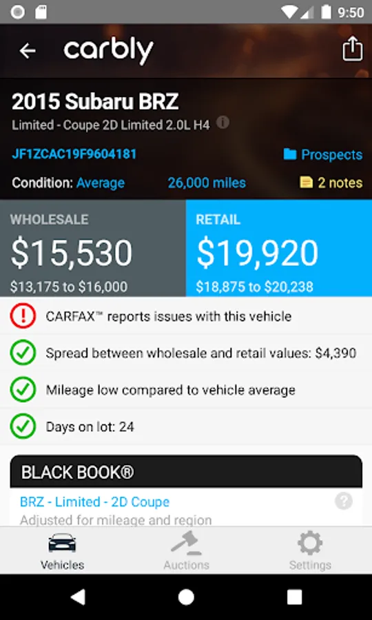 Just scan a VIN and Carbly shows you full wholesale and retail market data for the car or truck as well as local competitor inventory pricing.