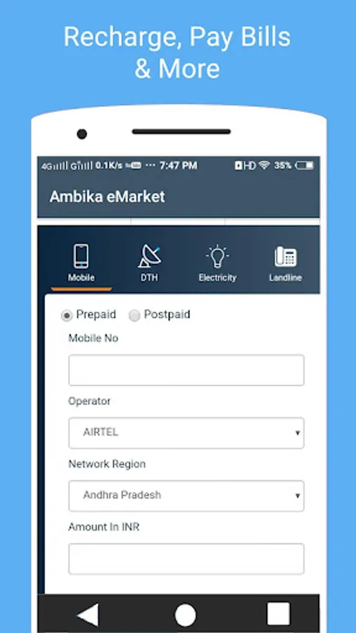 Recharge your prepaid mobile for major operators: Airtel, Jio, Vodafone, Idea. Recharge your DTH with all major service providers: Tata Sky, Dish TV, Airtel DTH, Reliance digital TV. Pay your electricity, postpaid, landline, broadband, gas & water bills.