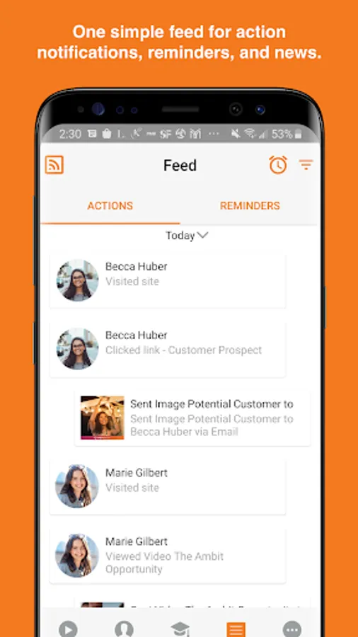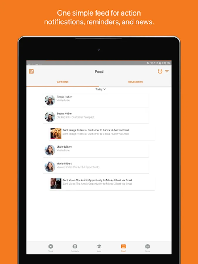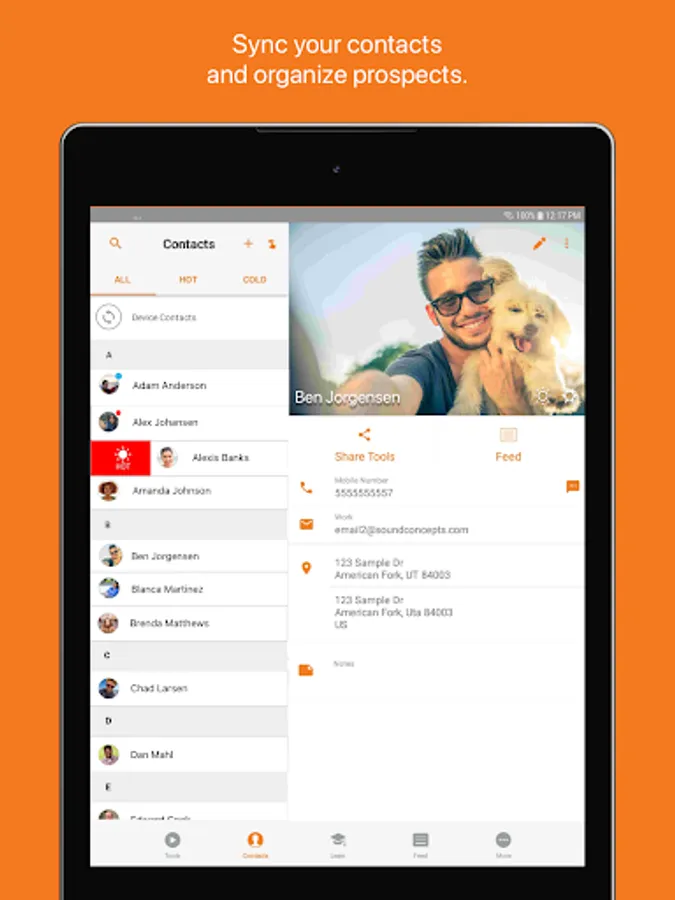 Contacts: Choose how to sync and manage your contacts. Swipe to sort them by interest level. You can make connections, add notes, or check out the Contact Feed to see the tools you’ve shared and contact actions.