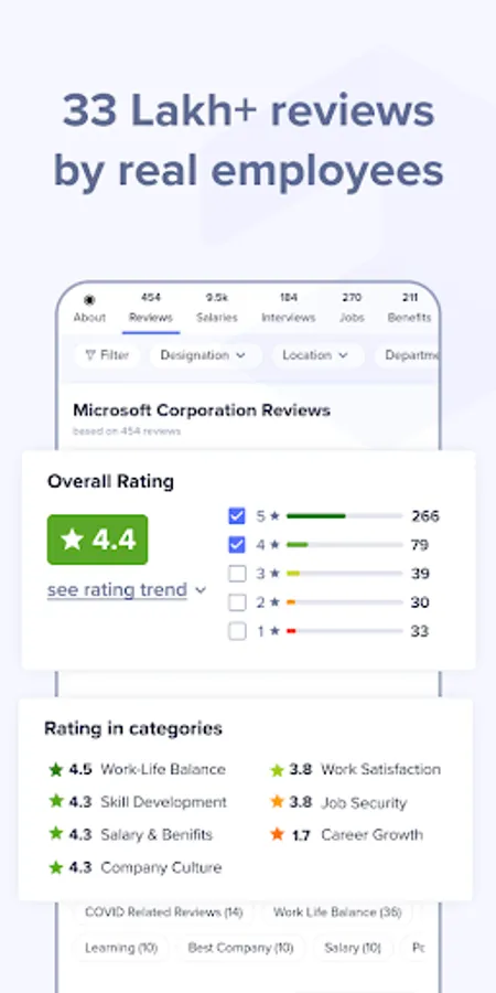 • Read company reviews from real employees about the work culture, job security, salary & benefits, work-life balance, etc.