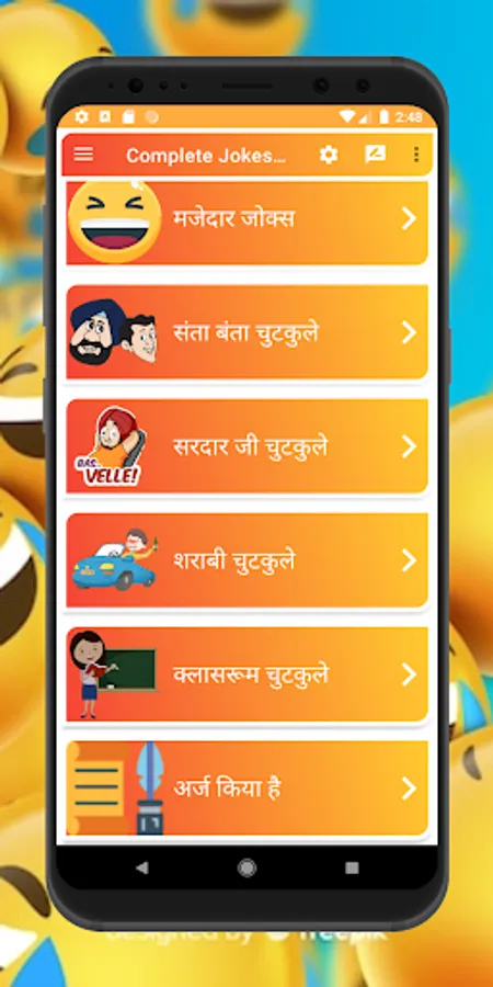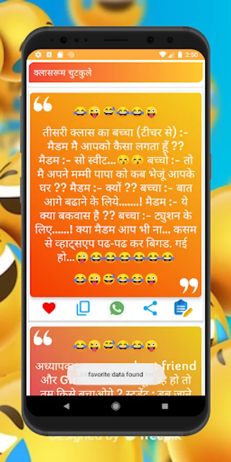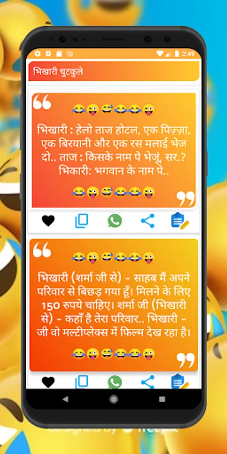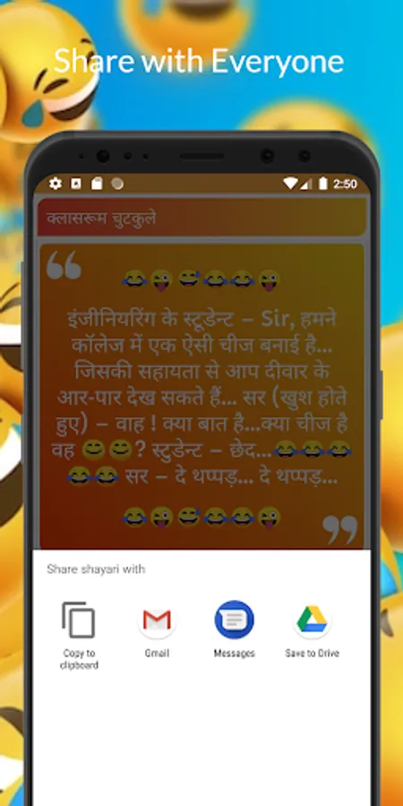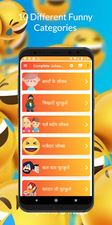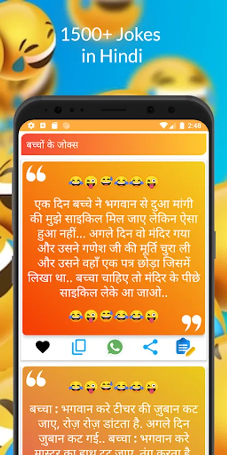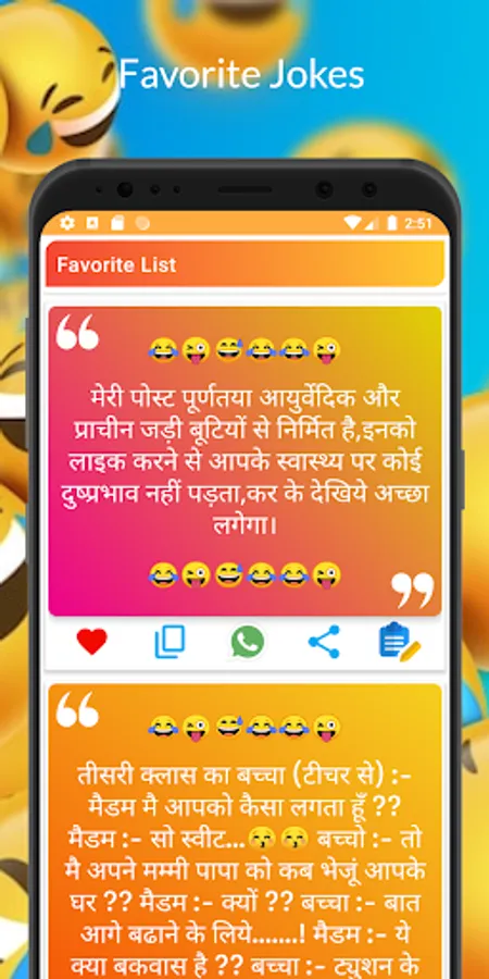 Funny Jokes - Hindi Chutkule & Funny Pictures If you find a joke you really like, you can use the share button to share it through your favorite instant messaging and social networking apps. Not only this, but you can also send these jokes through sms or via email. So basically, you can share the jokes through any program or app of your choice. You can bookmark as favorite jokes which contains the jokes you have liked, so you can have faster and better access to them later on. This app Presents a collection of hilarious jokes to keep you and your friends amused and entertained for hours. When someone asked for jokes no one remembered quickly, that time Hindi Jokes application is useful, colorful, and all in one. All jokes are collected carefully, so read and enjoy any age group.