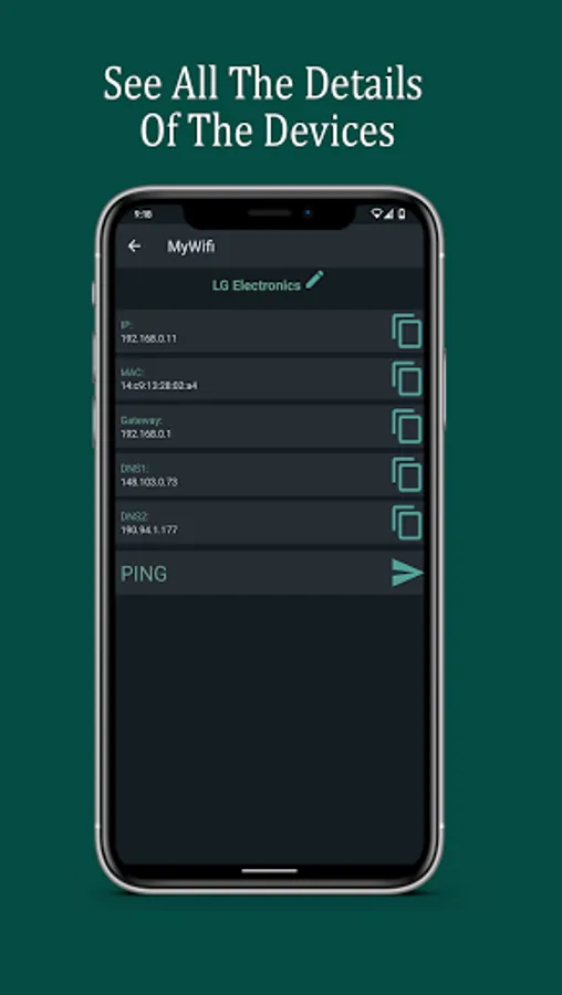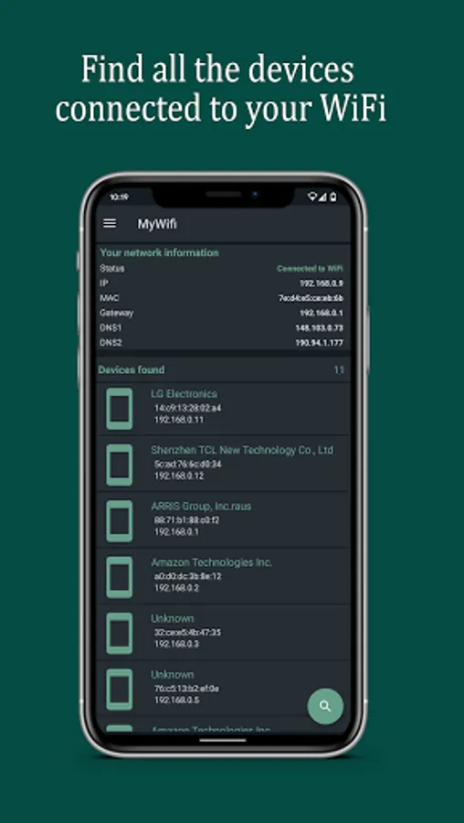 In this application you can see your network information, such as the gateway, DNS1, DNS2, MAC and the manufacturer's name of all connected devices.