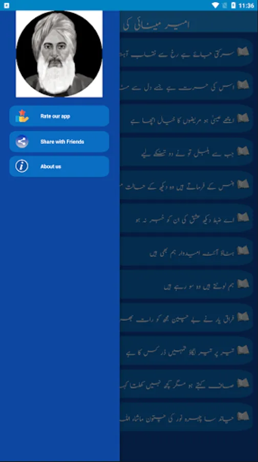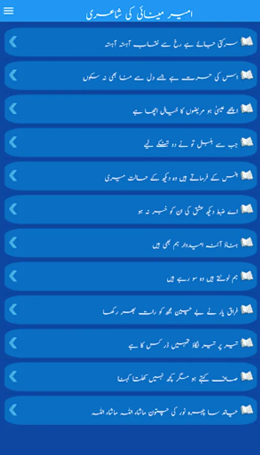 Amir Meenai App contain the best poetry from him. This app contain fine collection of the poet with beautiful design and structure and easy to use. You can copy the ghazals, increase font size, and decrease font size and also share the content of app with your friends directly without copying it from copy button.