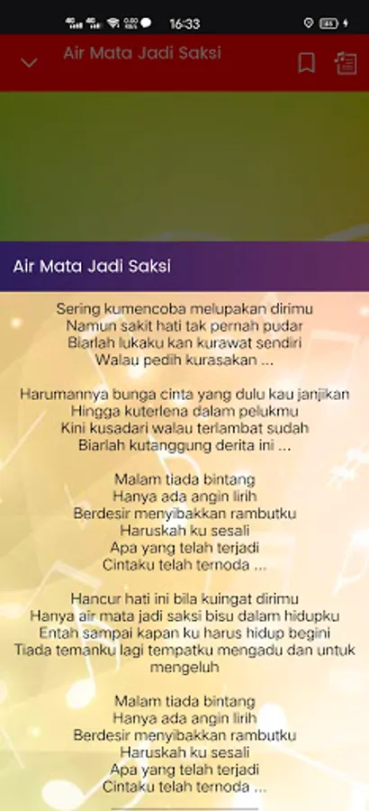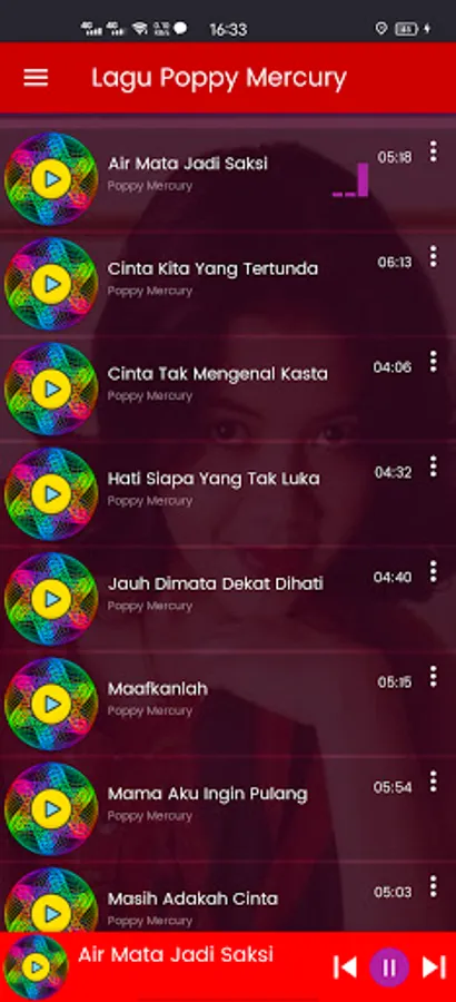 The Poppy Mercury Full Album application is an application that plays songs from nostalgia for the top singer Poppy Mercury. The songs are a collection of love-themed songs, top hits and nostalgic songs from poppy mercury that you can enjoy anywhere and anytime without the need for an internet connection. This application also provides lyrics for your guide to sing. So you can listen to music and read the text of the lyrics.