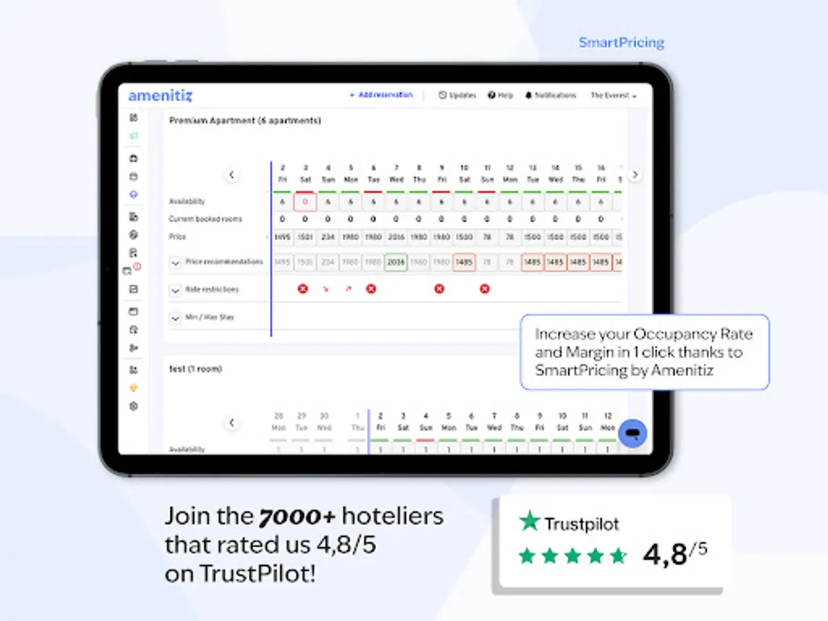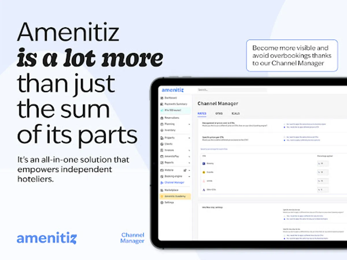 Amenitiz is the first all-in-one tool that allows independent hoteliers to save time, while driving direct bookings. No need to switch between a bunch of tools to check what is happening at your property: the website, PMS and channel manager all work together. What our partners love: overbookings are a thing of the past, our channel manager synchronises all your calendars!