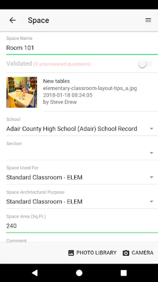 Surveys are broken down in multiple sections depending on the SpacePlanner(tm) Survey configuration in AssetPlanner(tm). An inventory of Program Spaces can also be completed which includes capturing the details of the space such as size, illuminance, window and conformance to standards. Specific data can be captured depending on the space type.