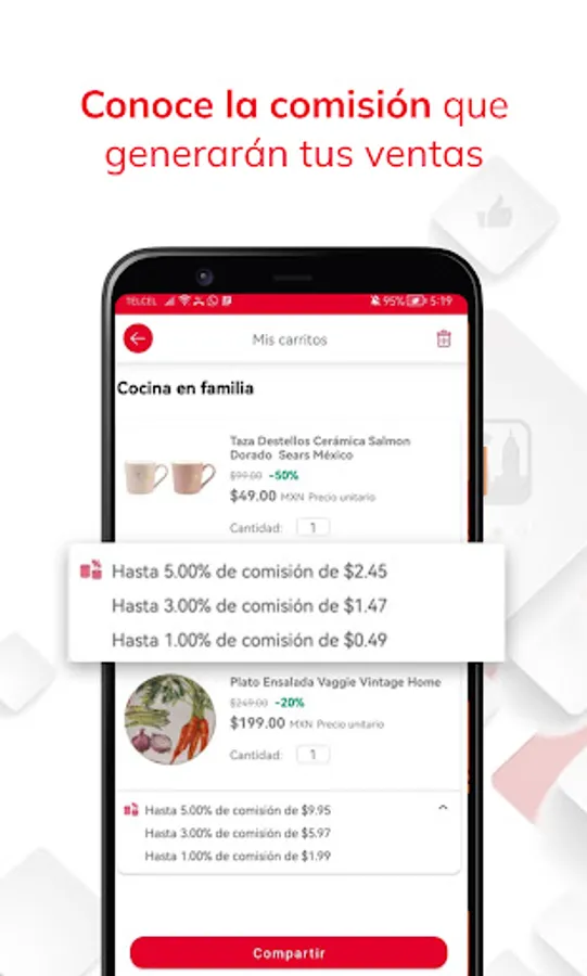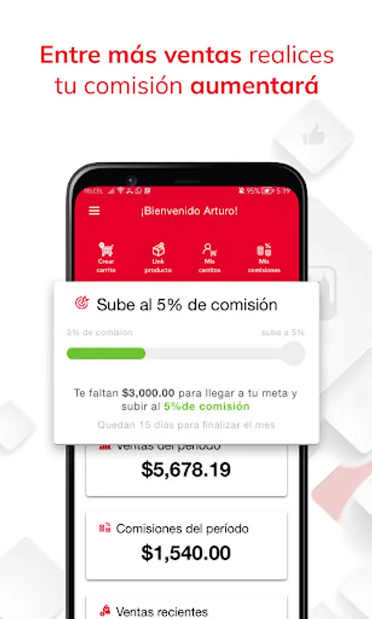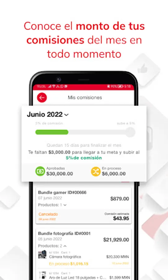 From the app you will be able to monitor your total earnings and per cart, see how much you need to raise the level of your commissions and manage your payment links.