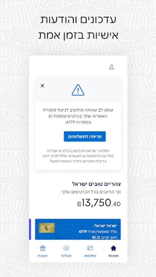 Benefits and experiences worth discovering - lounges, culinary events, discounts for flights, for international and local concerts, vacations in Israel and around the world, 1+1 for a variety of attractions, 1+1 for all movie theater chains and personalized benefits - we have an amazing selection of benefits to download directly from the application, including area Personal to view and manage the benefits you have downloaded. fun!