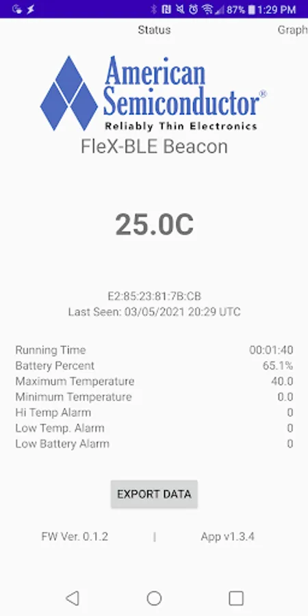 This app will show the data of the first FleX-BLE Beacon it sees as well it's configuration.