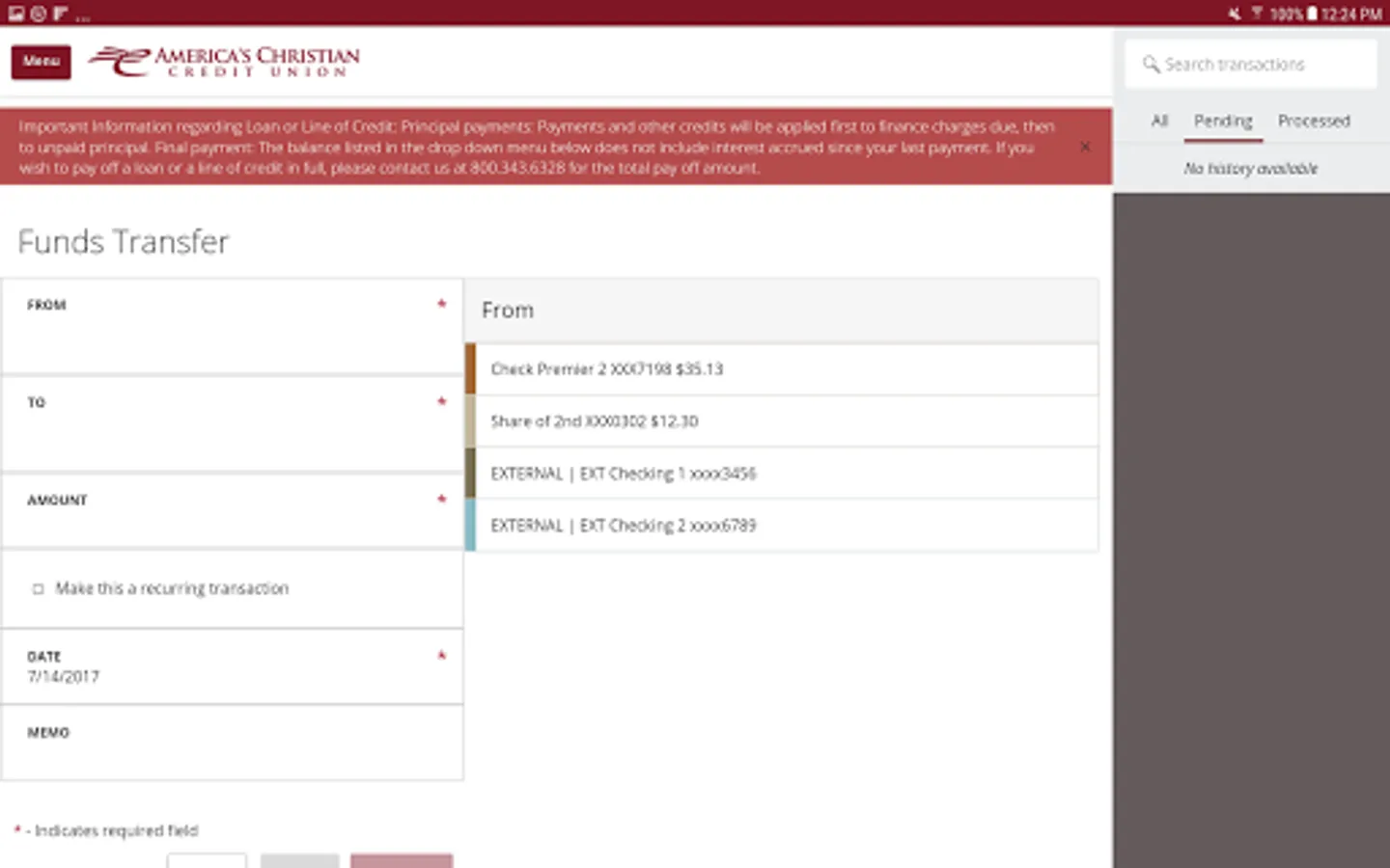 America's Christian Credit Union's Mobile Banking app gives you a secure, easy way to manage your money on the go. Use the app to check your account balances, view transaction history, transfer funds, deposit checks, pay a friend, pay a bill, find the nearest ATM location and much more. Our Mobile Banking app is specifically design for you and the device you are using. The tablet-first approach provides a unified look across all devices.