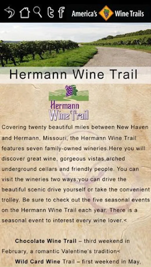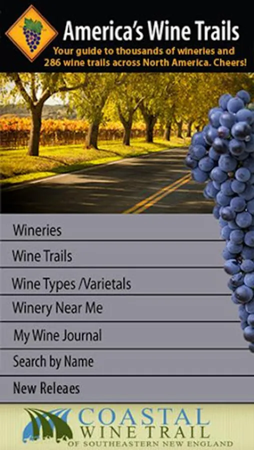 America's Wine Trails app is a personal guide to over 5,500 wineries and access to310 wine trails throughout the United States. View nearby wineries on a map using your phone's location or search for wineries and vineyards by state.