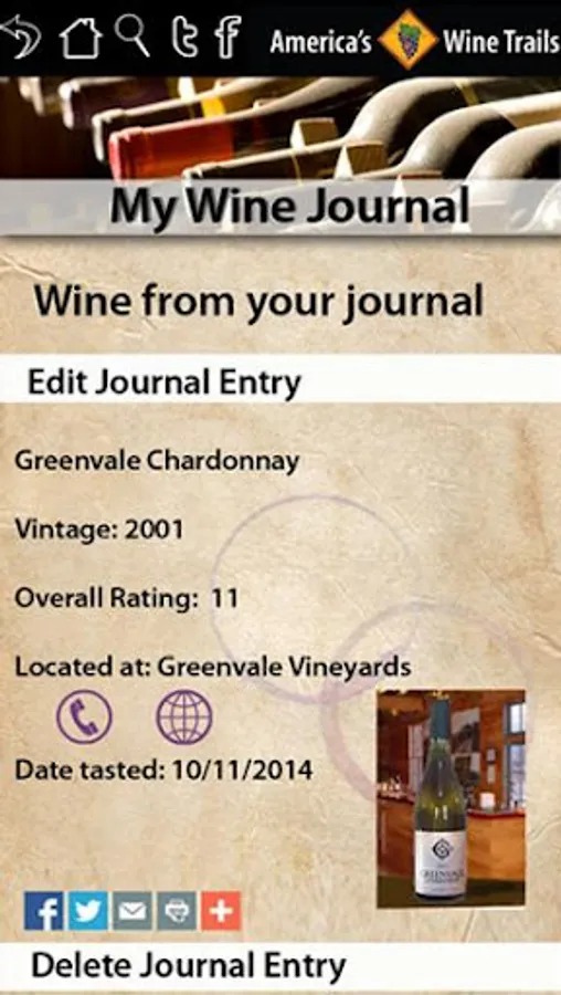 In addition to locating wineries and wine trails, the app is a great companion in the winery tasting room. It provides a tasting room virtual experience using the "Wine Journal" feature. In the Journal, you can use Tasting Notes to record a wine, vintage, varietal and winery where tasted. Rate the wine with a simple system, add a picture of the wine bottle and any personal notes. It's simple to use with its search matrix for adding wineries and varietals. It will even add the winery's phone number and website hyper-links automatically. Later you can recall any wine by using a search option.
