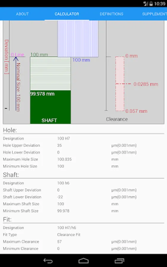 The calculator works in line with ISO 286-1 (2010), ISO 286-2 (2010) and ANSI B4.2 (1978) standards which are based on metric units. According to the input parameters of nominal size and hole/ shaft tolerances, size limits and deviations for hole/shaft are calculated and fit type is selected among the clearance, transition and interference fits.