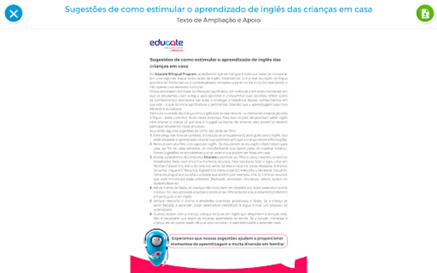 Aimed at students and teachers of Educate Bilingual Program, with him you download the various digital multimedia content provided by the program, which allows the study later offline (without internet connection).