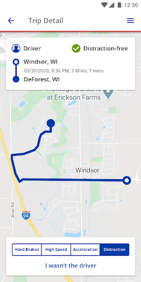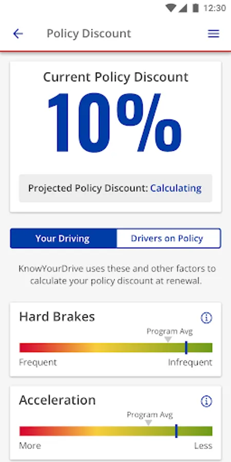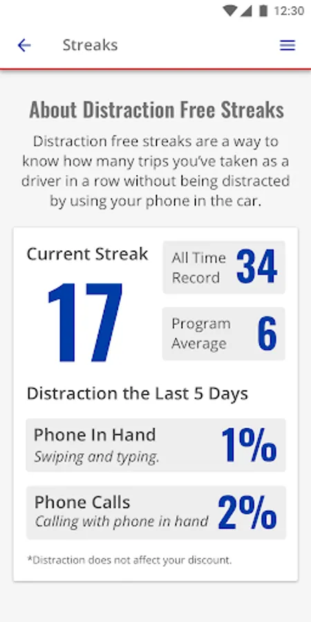 The app displays your discount, trip details, safe driving tips and keeps track of your streak of distraction-free trips. Additional detail is provided on your driving versus others who have the app.