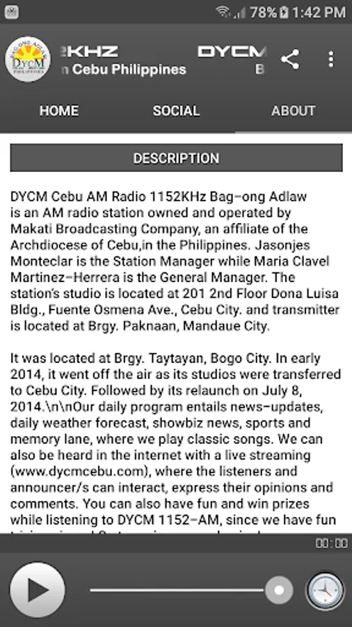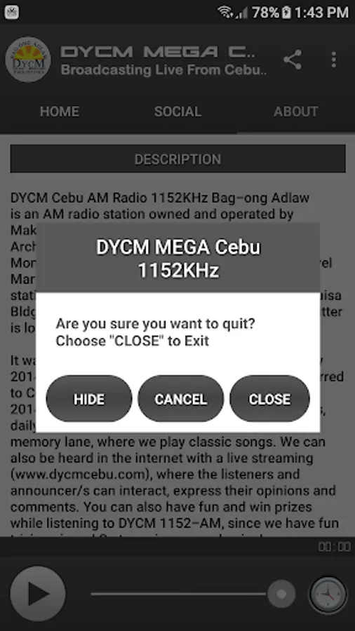 This application is the exclusive, official application for DYCM MEGA Cebu 1152KHz under an agreement between DYCM MEGA Cebu 1152KHz and AMFM Philippines.