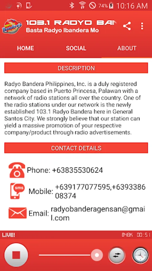 Radyo Bandera Philippines, Inc. is a duly registered company based in Puerto Princesa, Palawan with a network of radio stations all over the country. One of the radio stations under our network is the newly established 103.1 Radyo Bandera here in General Santos City. We strongly believe that our station can yield a massive promotion of your respective company/product through radio advertisements.