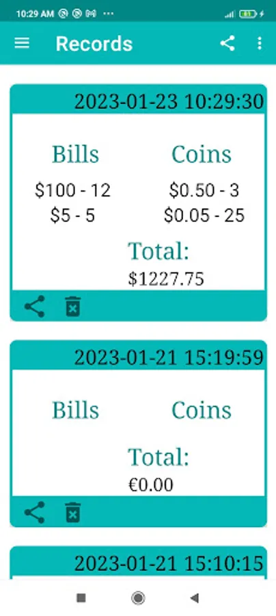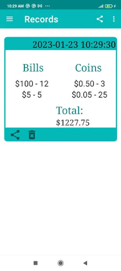 You can share the daily record broken down by bills and coins as well as the total amount of money and the date