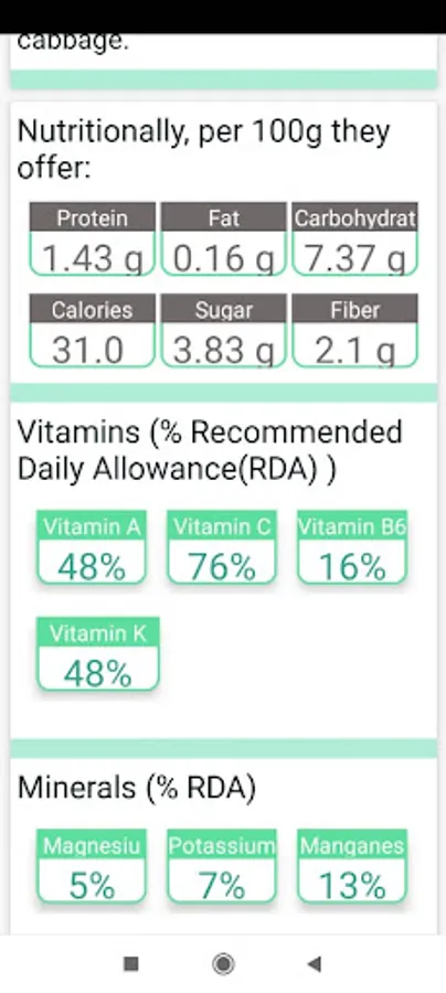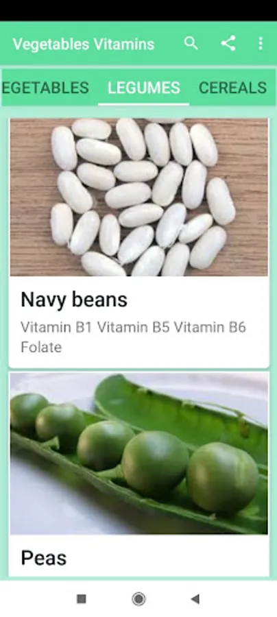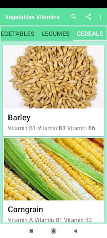 - SIMPLE TO USE: You will have a list of all vegetables, legumes, and cereals and you can touch anyone and you will see all their vitamins, proteins content and minerals