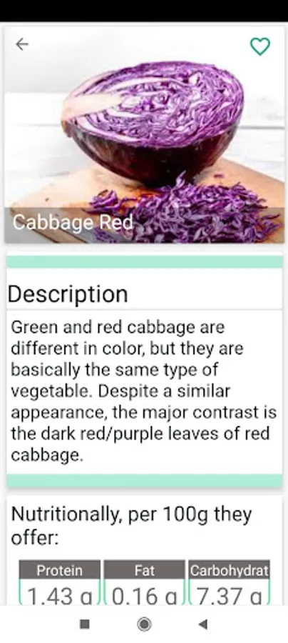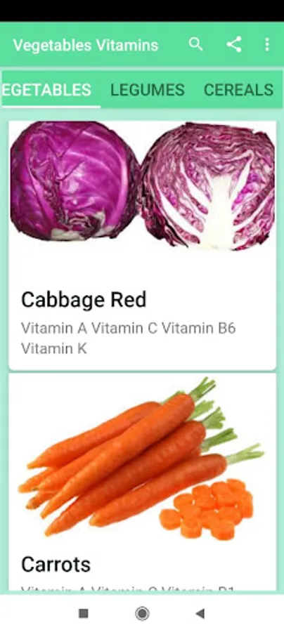 VEGETABLES VITAMINS is a FREE and OFFLINE app available for Android that contains a variety of vegetables, legumes, cereals and their nutrients profile with vitamins and minerals. Also, this app includes vegetarian recipes.