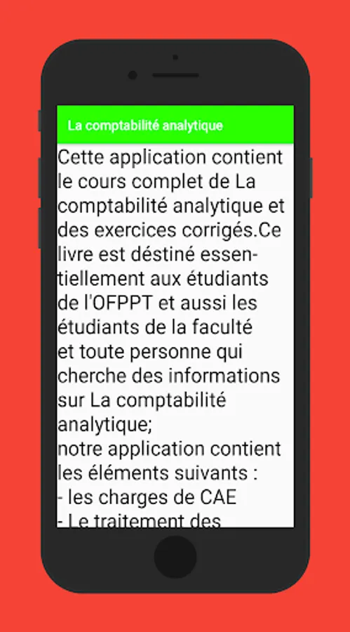 Cette application contient le cours complet de La comptabilité analytique et des exercices corrigés.Ce livre est déstiné essentiellement aux étudiants de l'OFPPT et aussi les étudiants de la faculté et toute personne qui cherche des informations sur La comptabilité analytique;